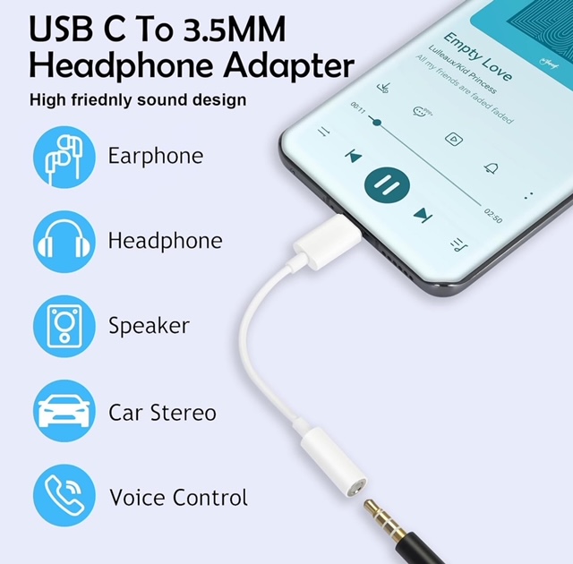 Convertidor de USB Tipo C a auxiliar para Jack estándar de 3.5mm, permite conectar, audífonos o bocinas en smartphones que no cuenten con auxiliar integrado y sólo por medio de USB Tipo C.