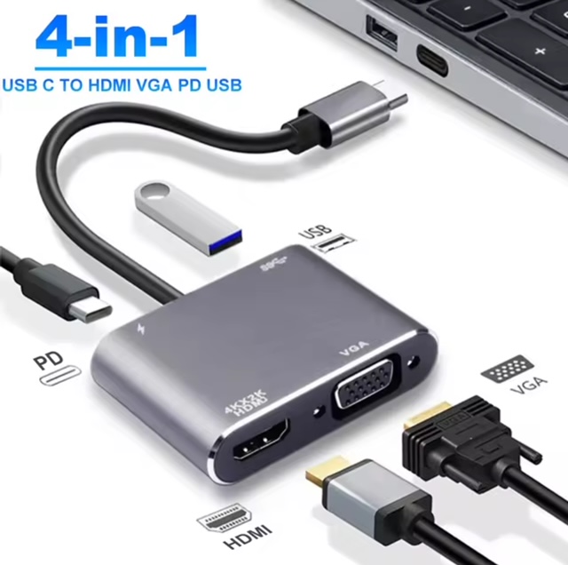 Adaptador 4 en 1, permite transformar su puerto USB tipo C en una conexión HDMI y otra VGA, las cuales pueden trabajar en simultaneo o en pantalla extendida si su dispositivo lo permite, a parte también cuenta con un puerto USB normal 3.0 de alta velocidad y un puerto USB tipo c extra para brindar carga al dispositivo